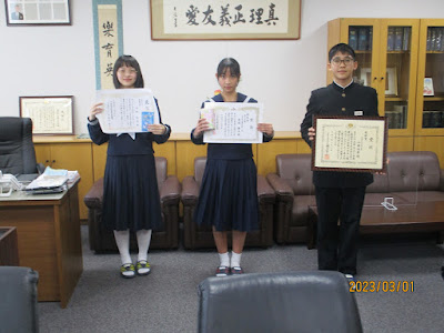 (3/1) 表彰伝達 本校の生徒が、令和4年「宇宙の日」記念行事全国小・中学生作文絵画の部(コンピュータ作品の部)において最優秀賞、第58回「わかば」作文・図画コンクール作文の部において優良賞、第41回全国中学生人権作文コンテスト全国大会において奨励賞を受賞しましたので、その3名の生徒へ校長室で表彰伝達を行いました。何れの賞も全国大会のもので素晴らしい結果です。3名の皆さん、おめでとうございます。